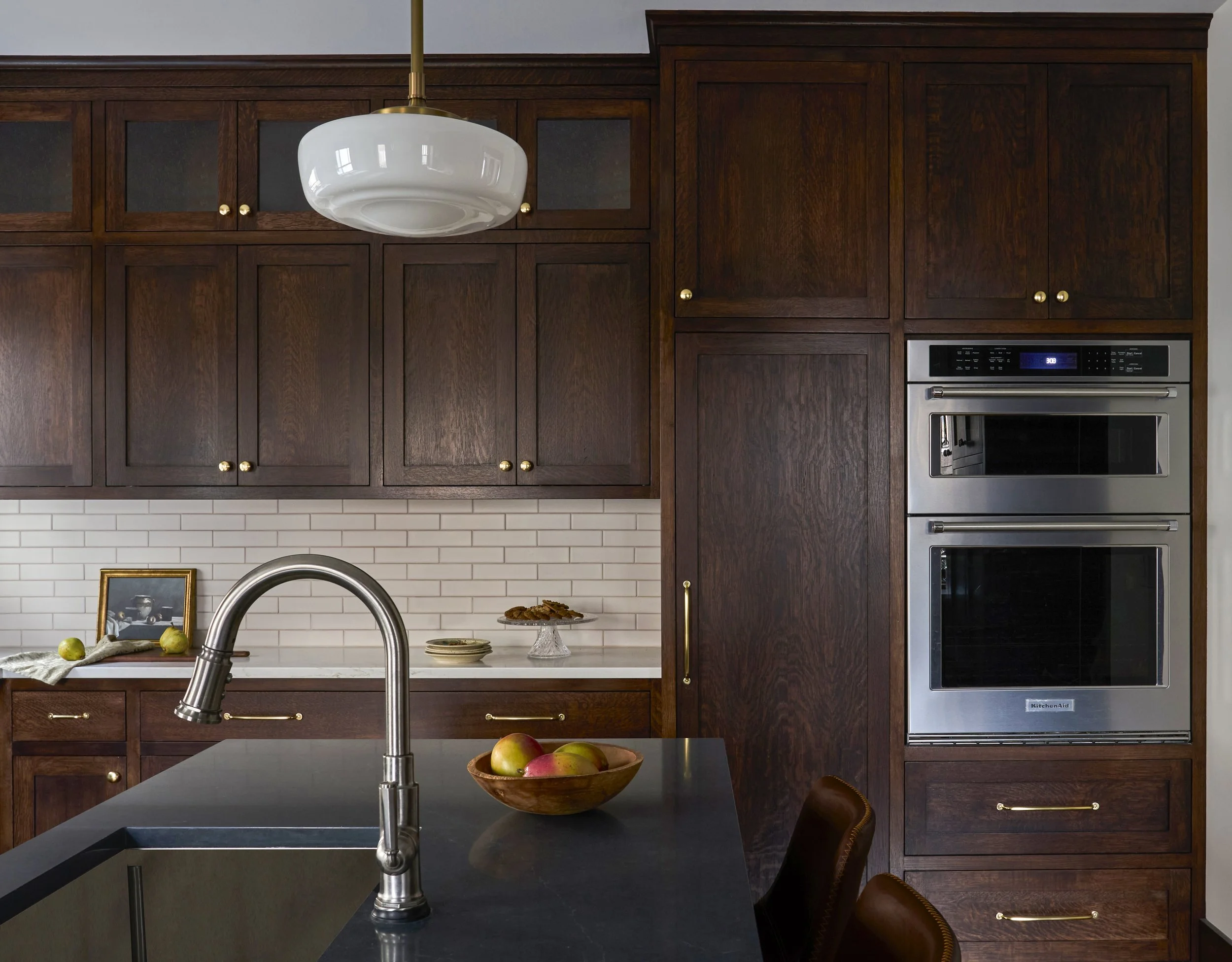 Custom inset quarter-sawn oak cabinetry surrounds the kitchen and matches the woodwork throughout the home.