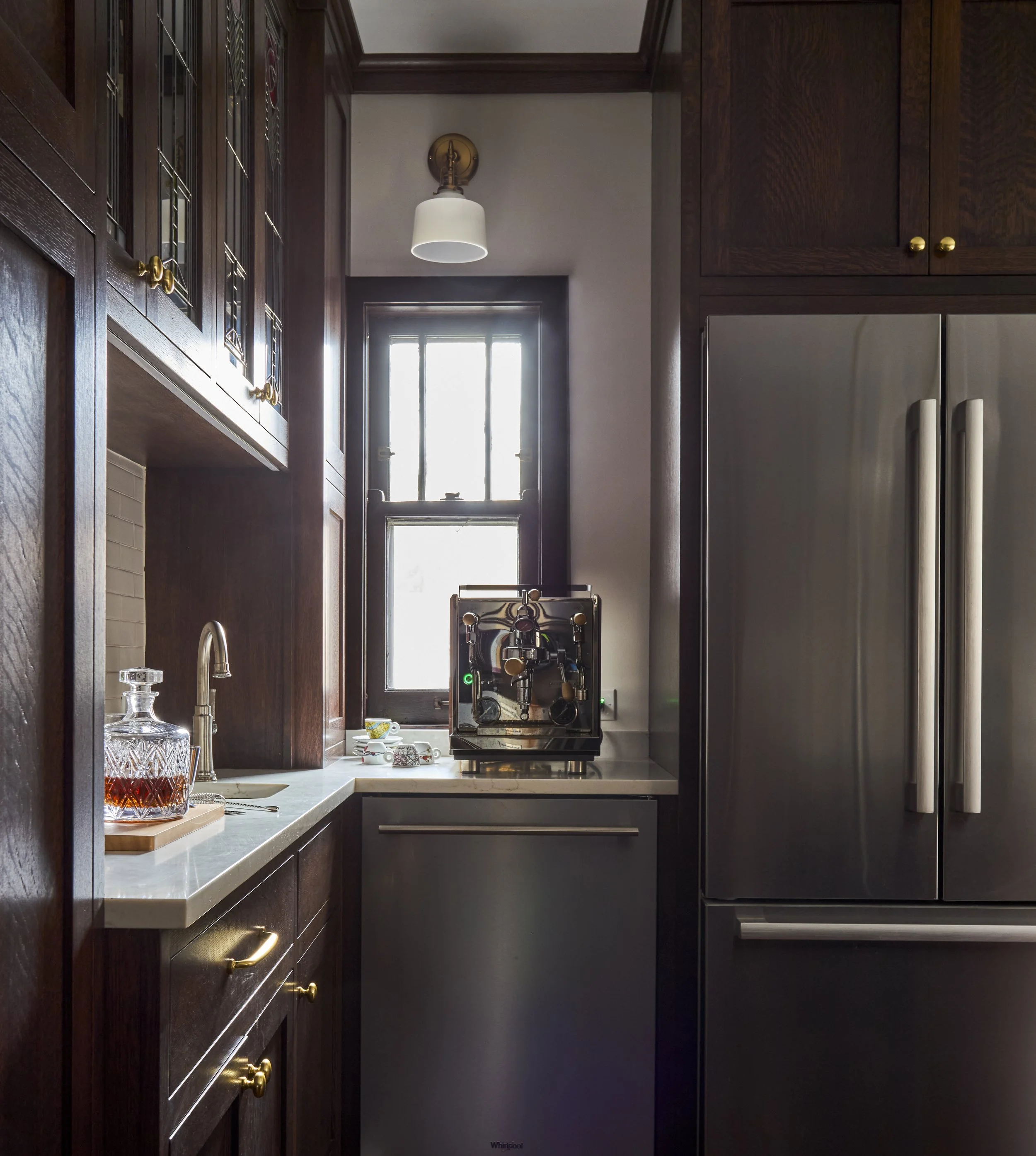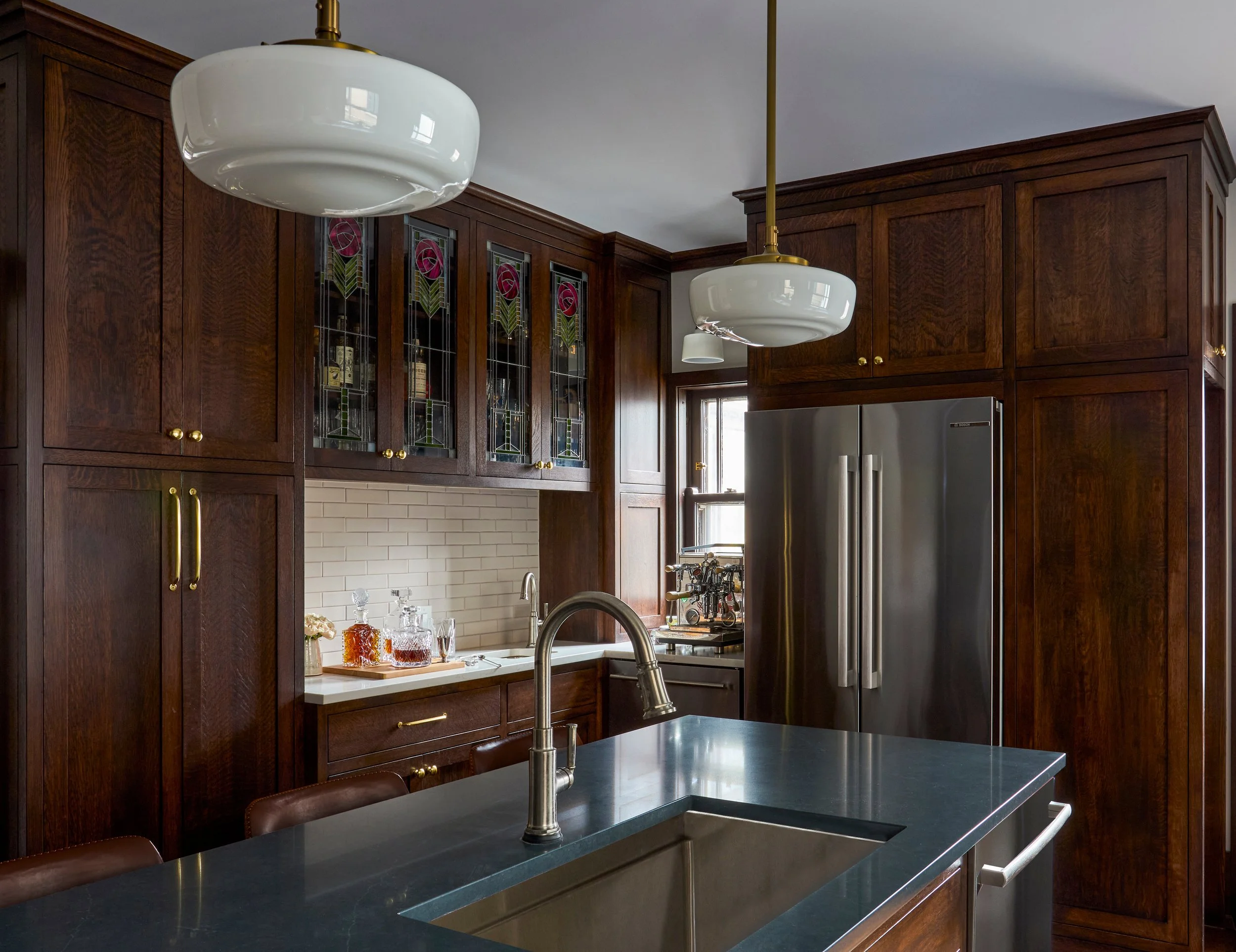 A bar area features gorgeous locally-made stained glass panels, designed to mimic the original living room stained glass. A new bar sink gives easy access to the adjacent coffee area.