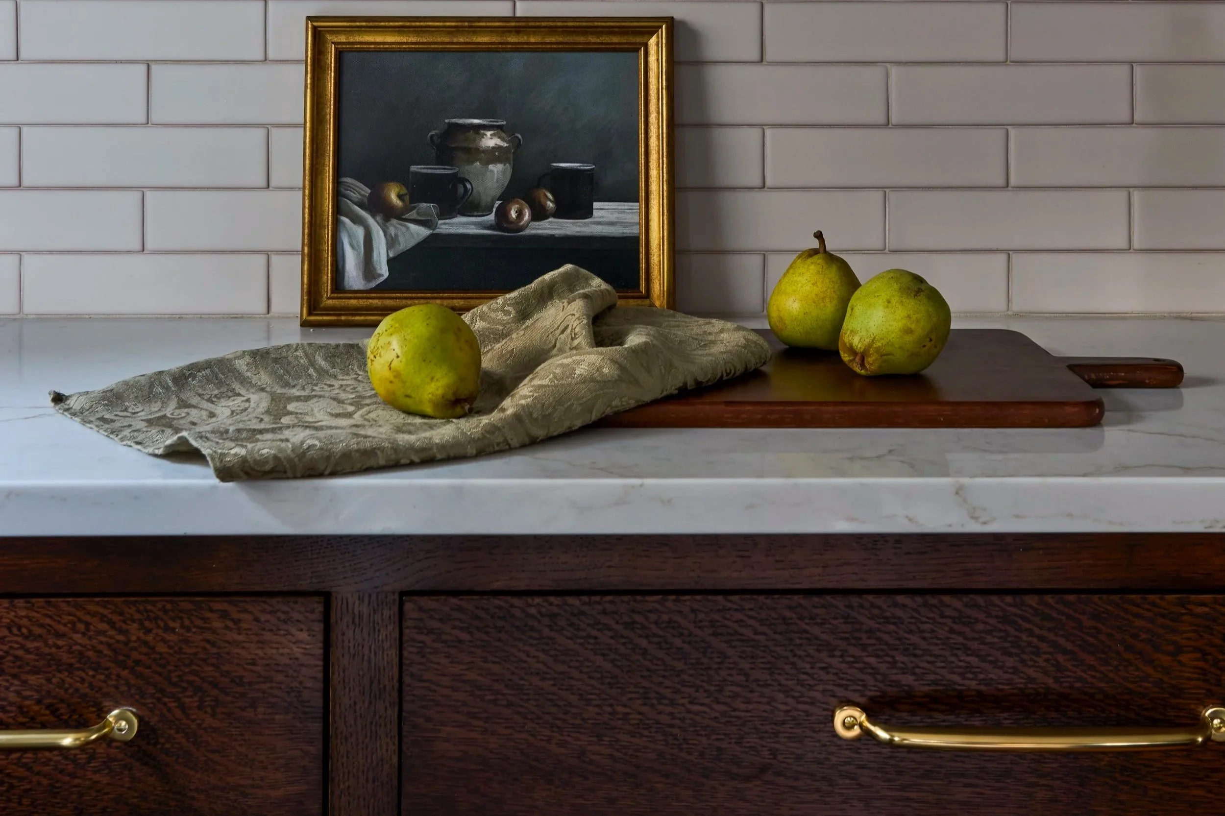 Matte-finish handmade ceramic tile pairs beautifully with warm quartz counters, textural wood, and antique brass hardware.