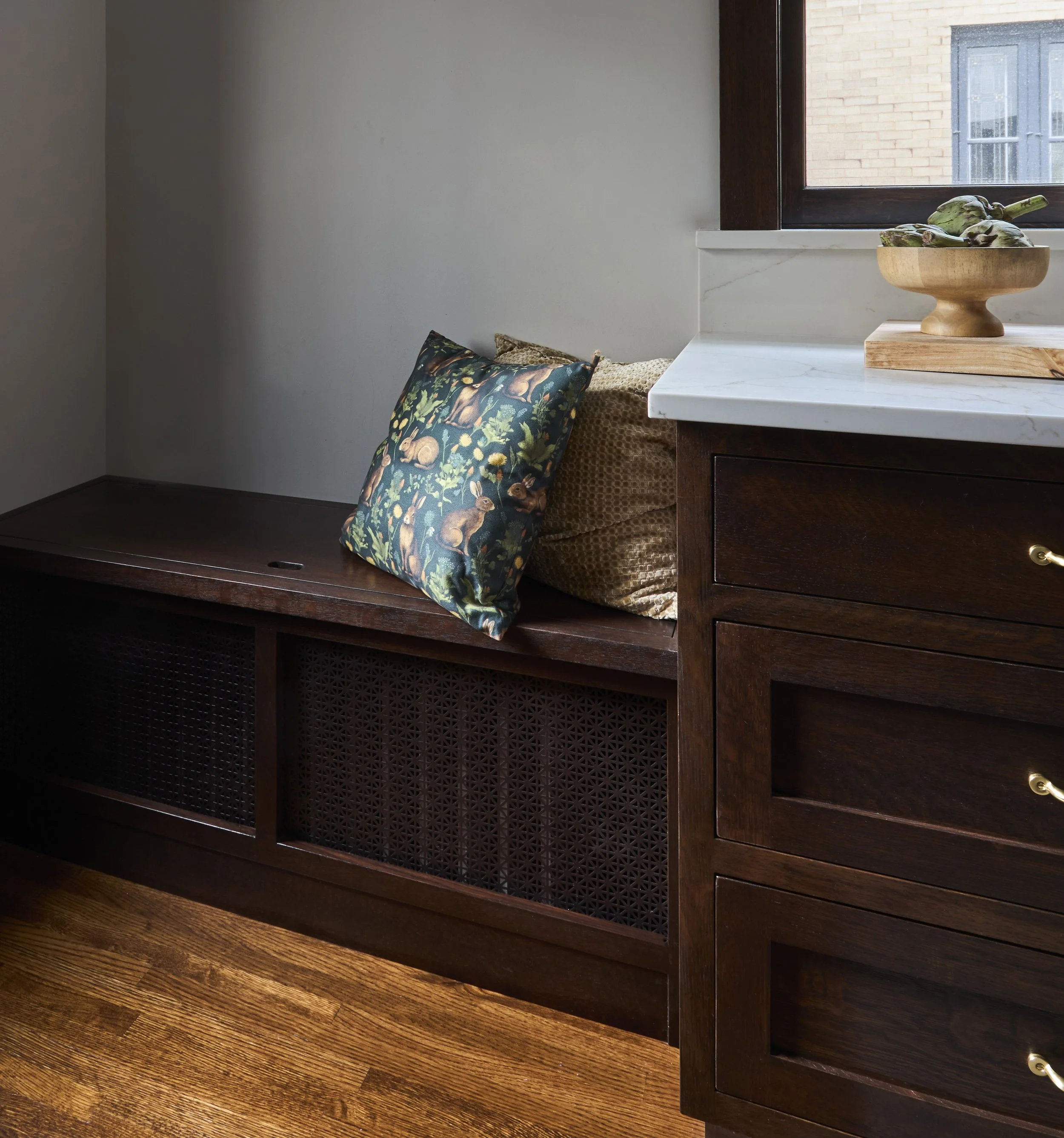 A small bench seat conceals a radiator and offers a place to load groceries or put on your shoes.