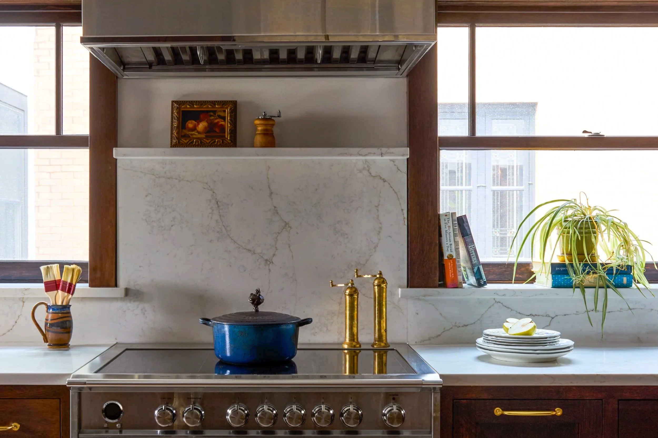 An induction range and custom hood fit perfectly between the two existing windows. New quartz window sills were added for ease of clean-up.