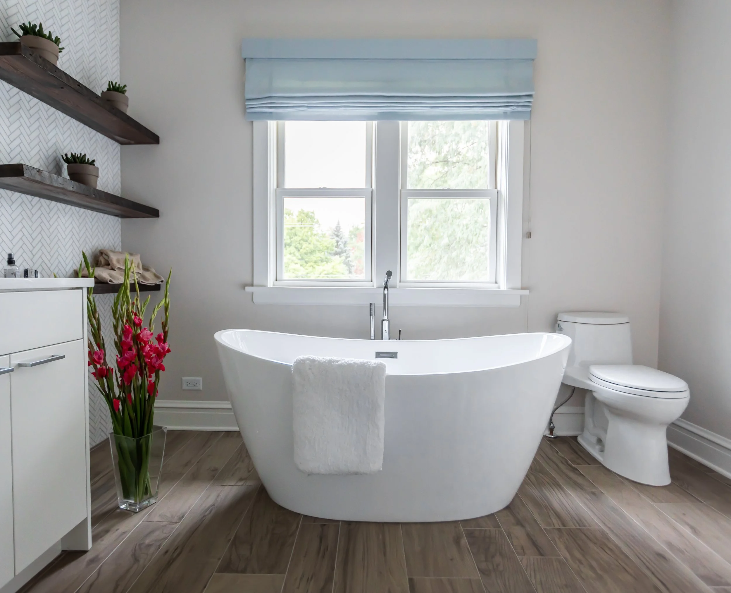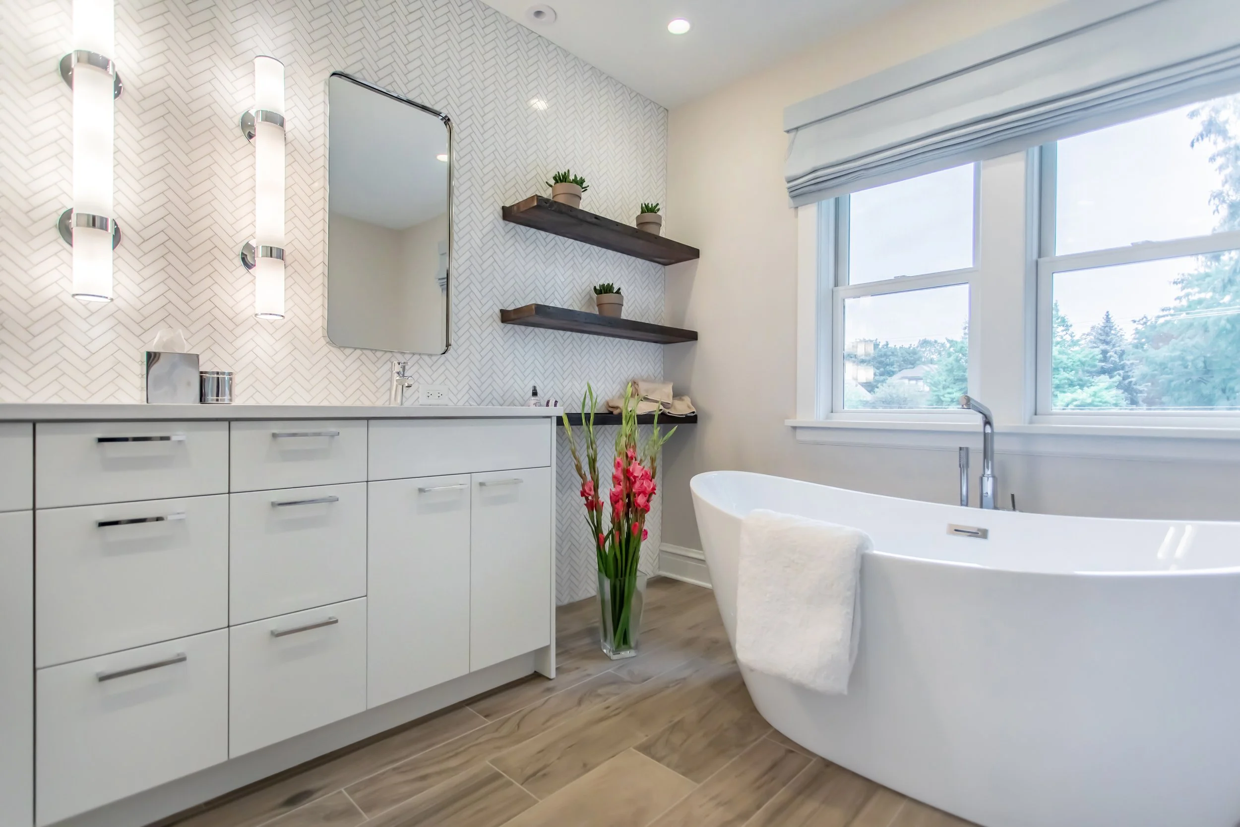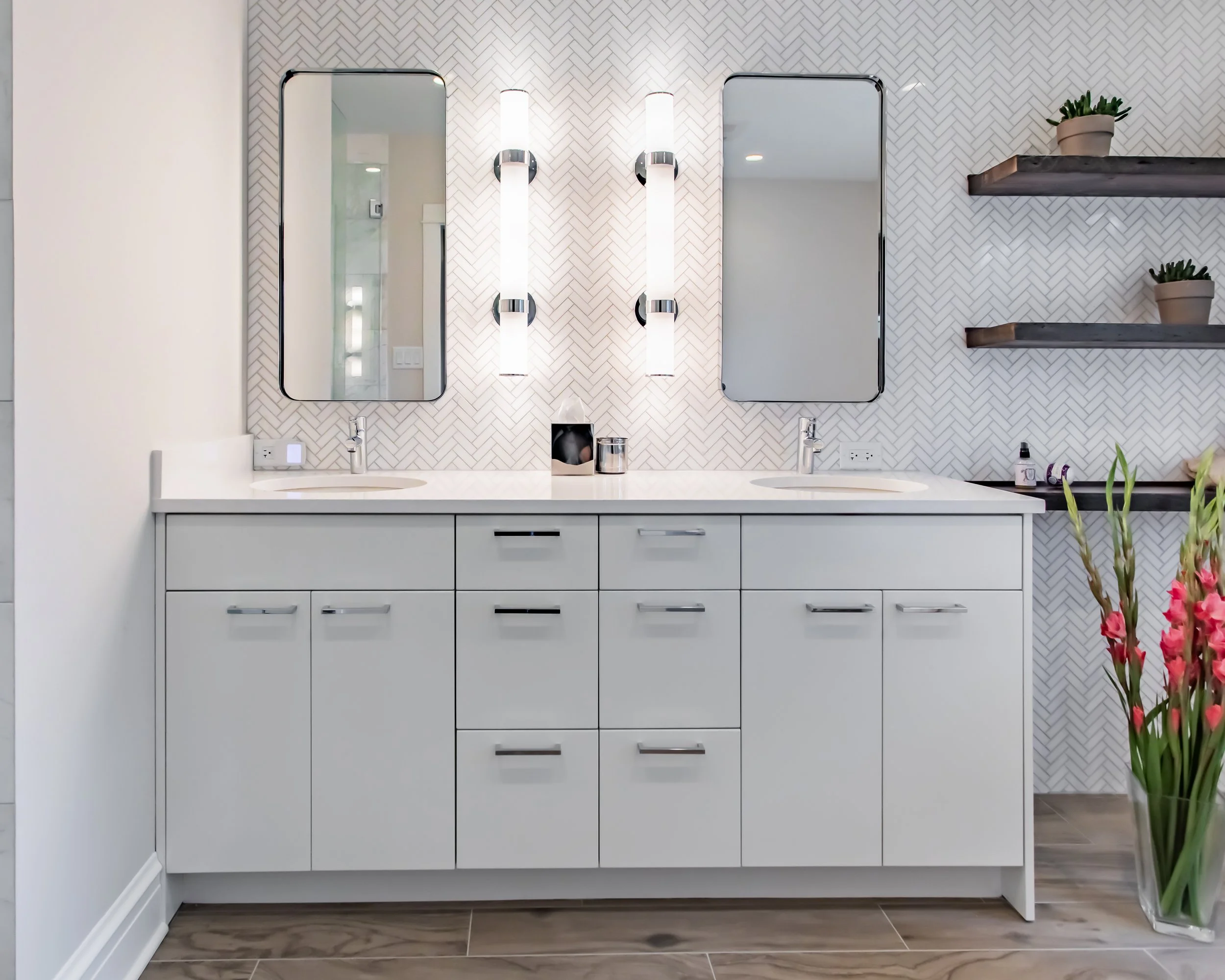 There’s a nice symmetry to the vanity, and reclaimed floating shelves provide additional storage.