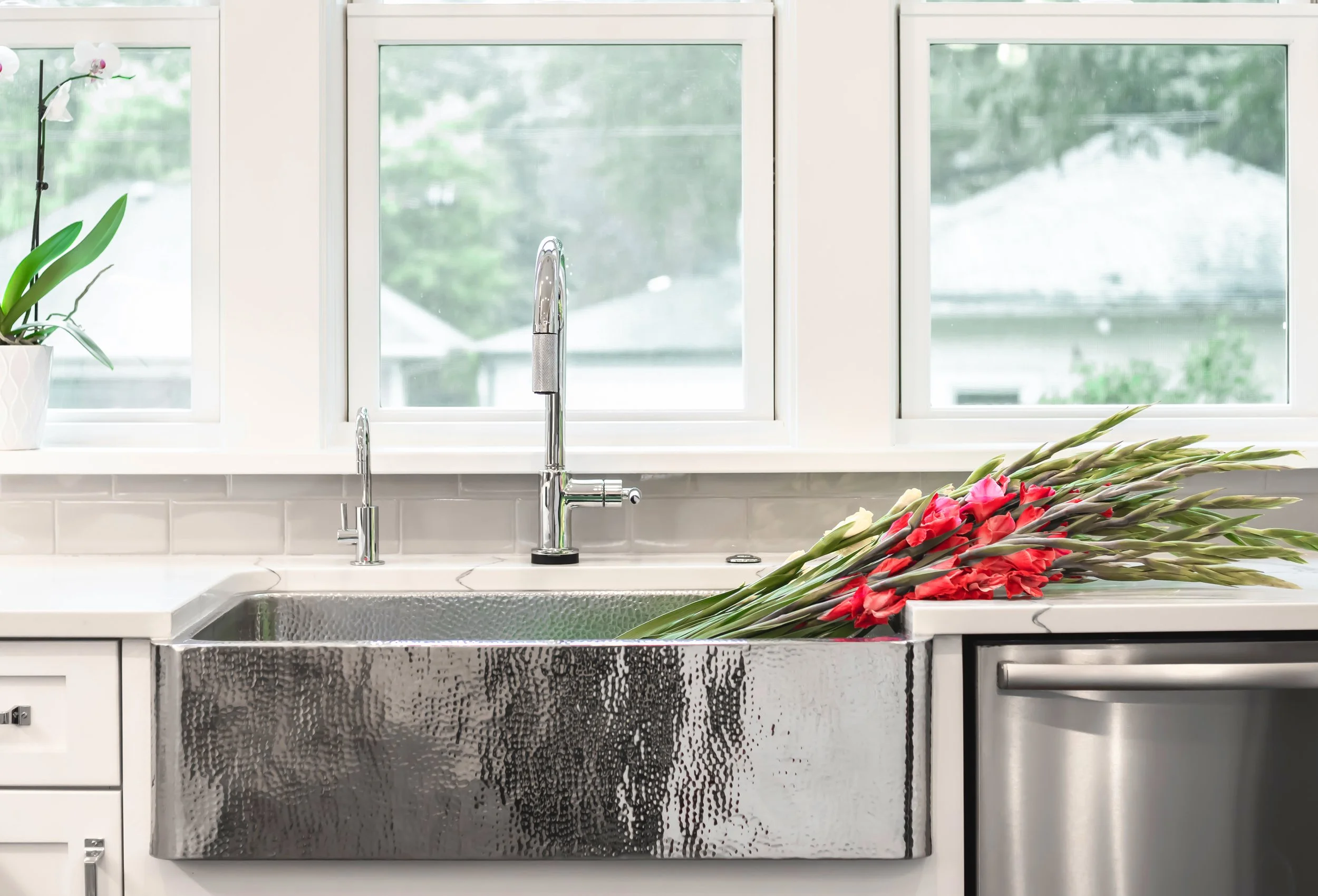 A hand-hammered, stainless-steel farmer’s sink is both classic and contemporary, bathed in light from west and north-facing windows.