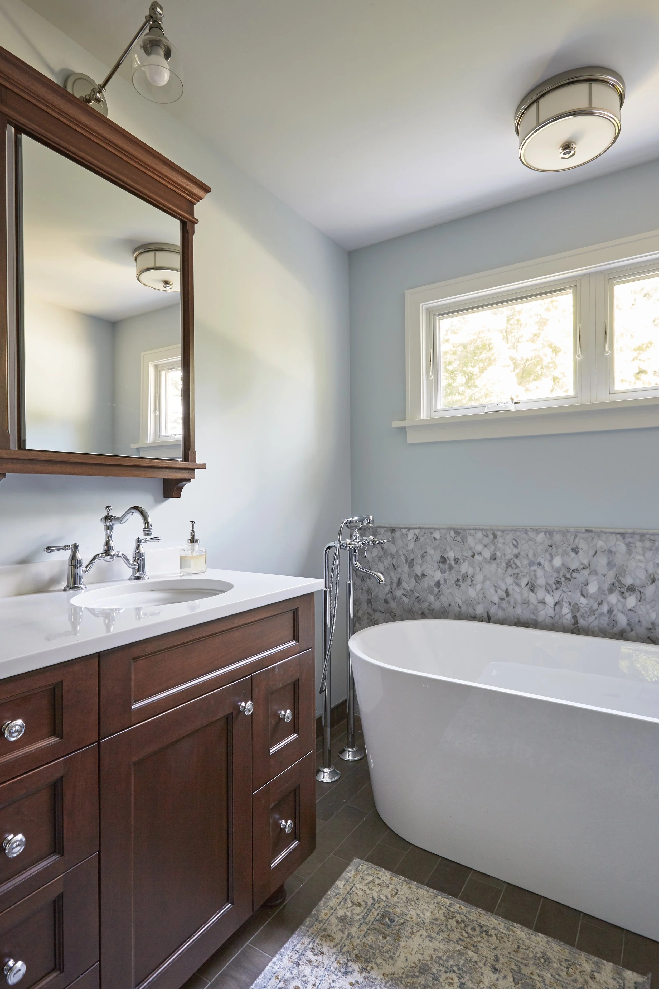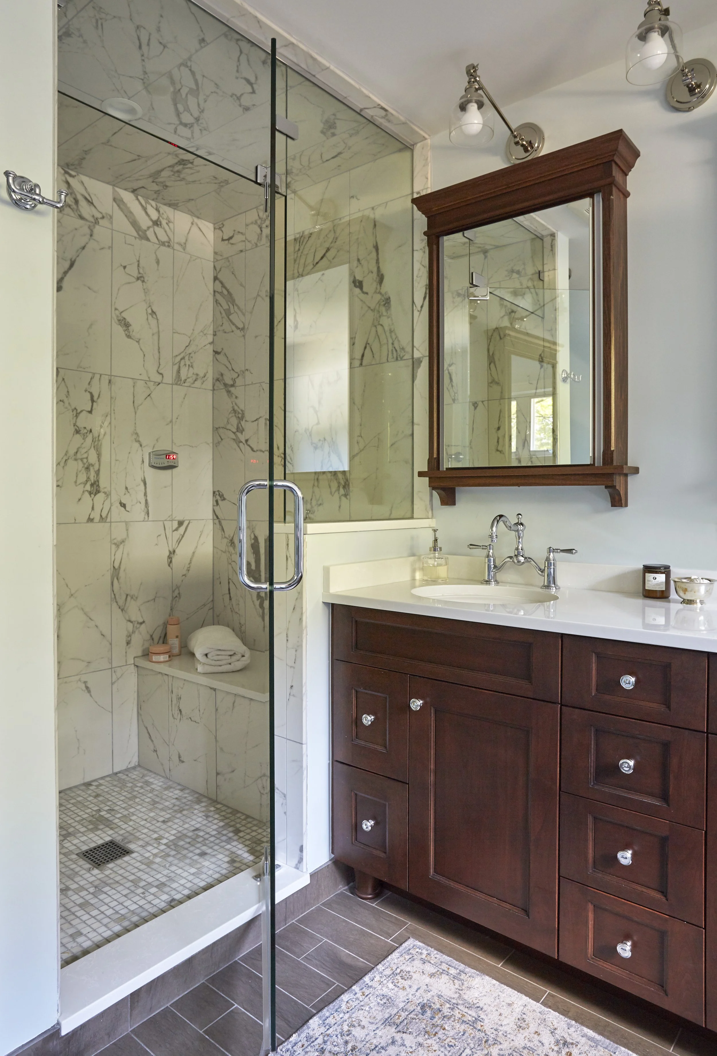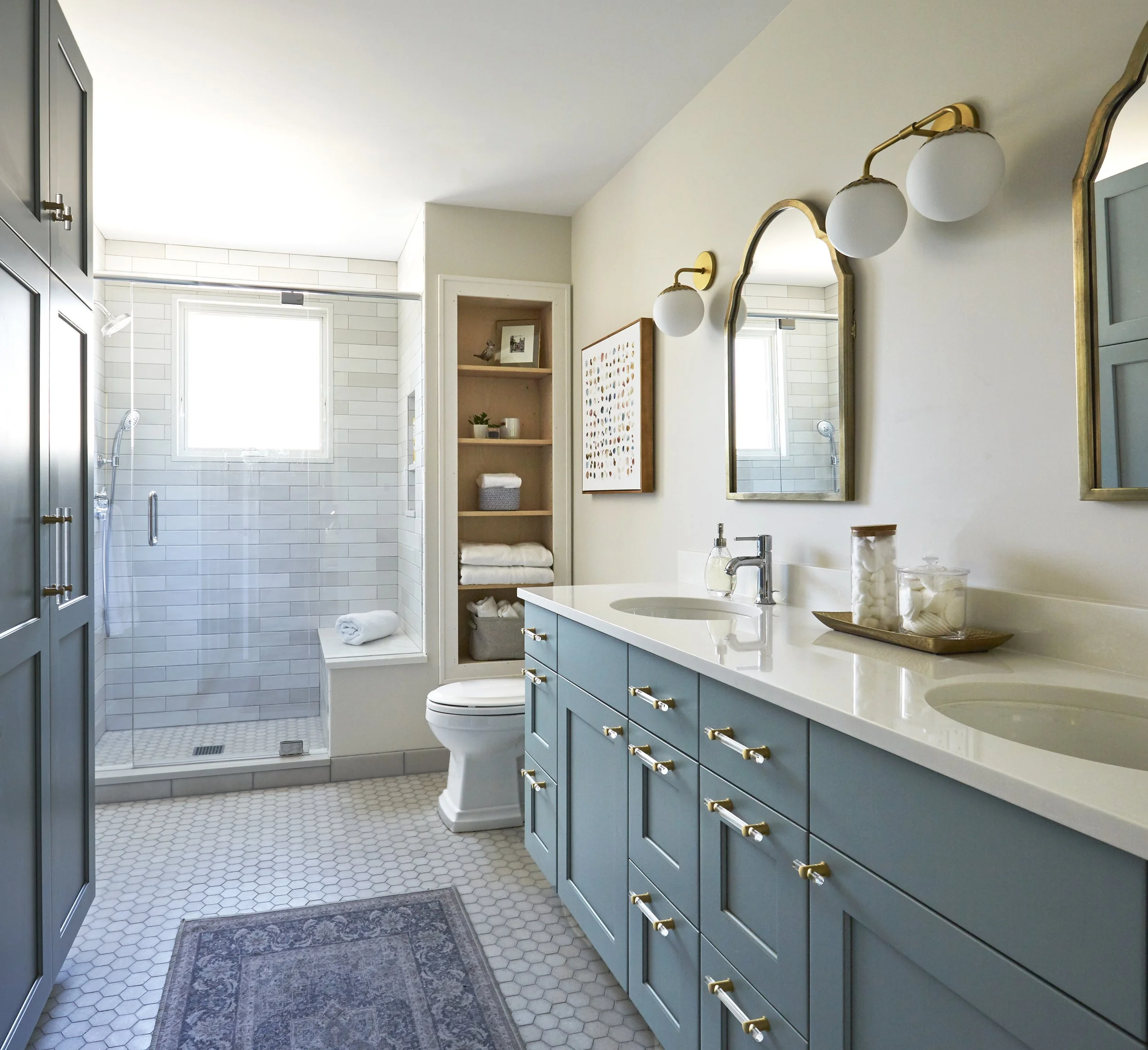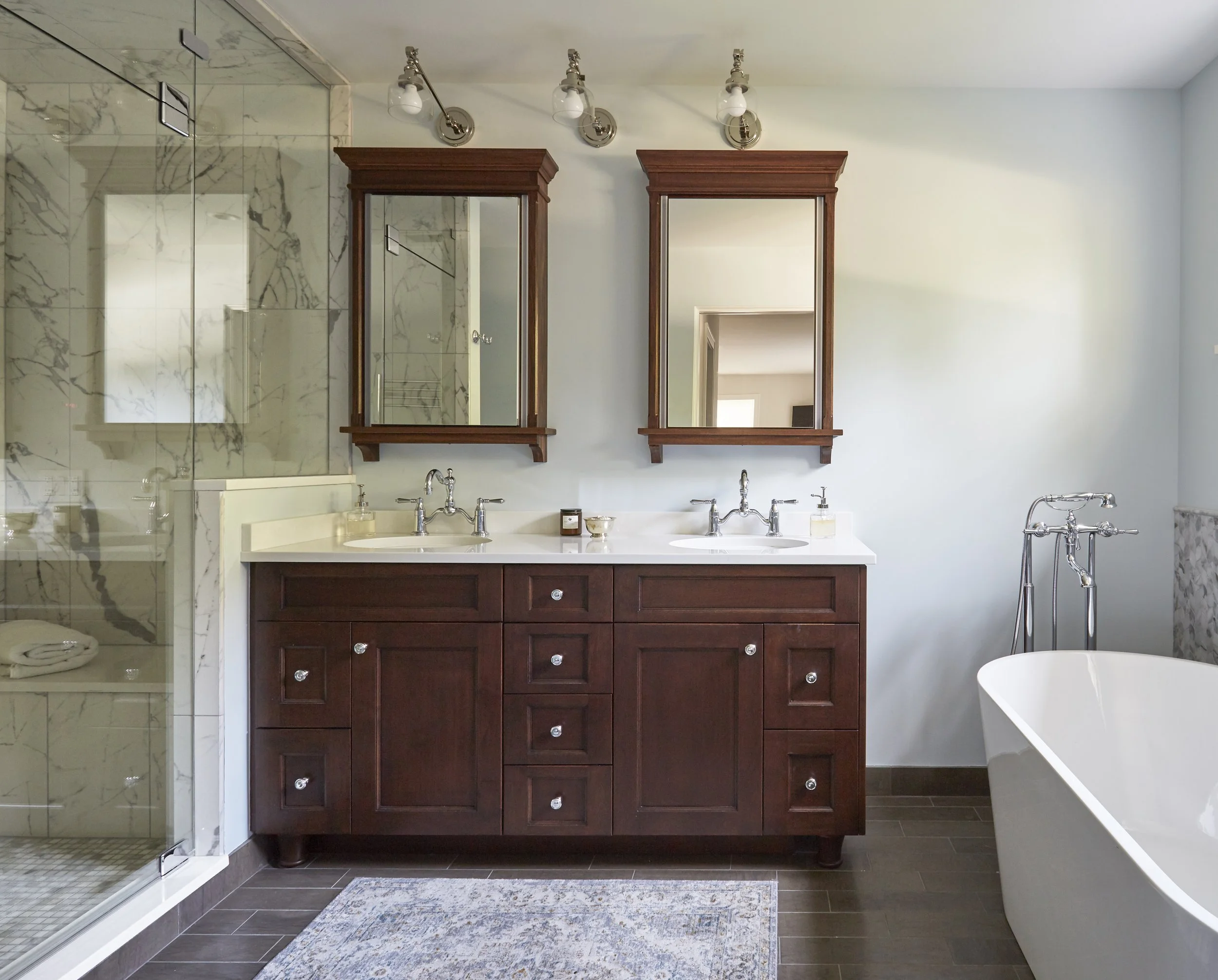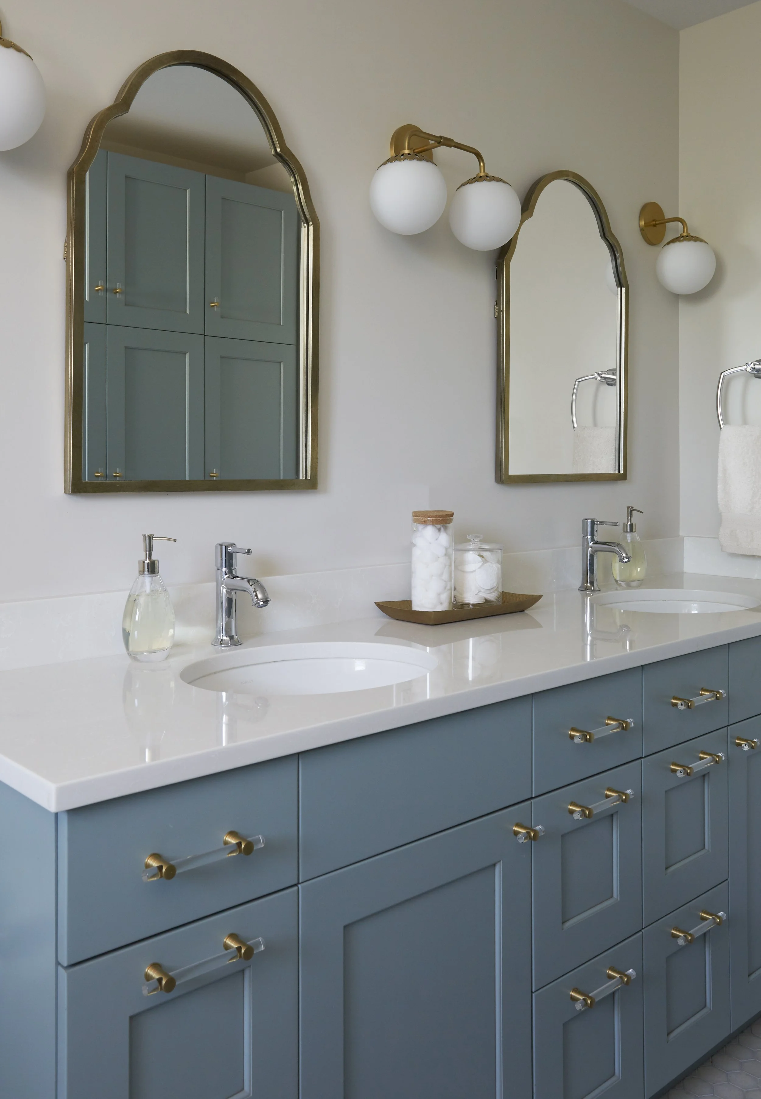 We consider the entire space, including things like crown-moulding-topped mirrors, to complete the look.