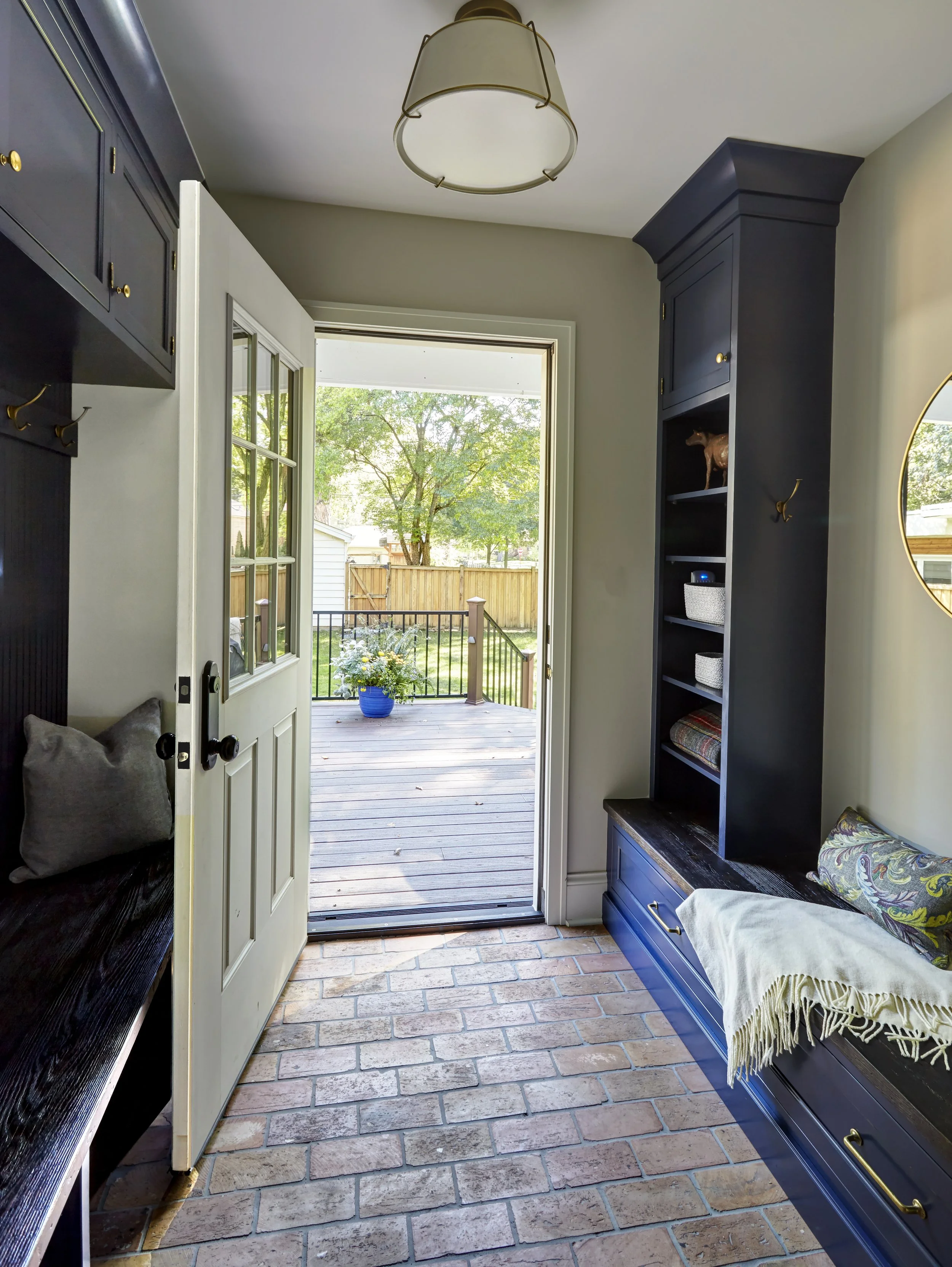 The mudroom features reclaimed Chicago brick flooring, and the powder room is a standout space, including a countertop made from reclaimed train car flooring.