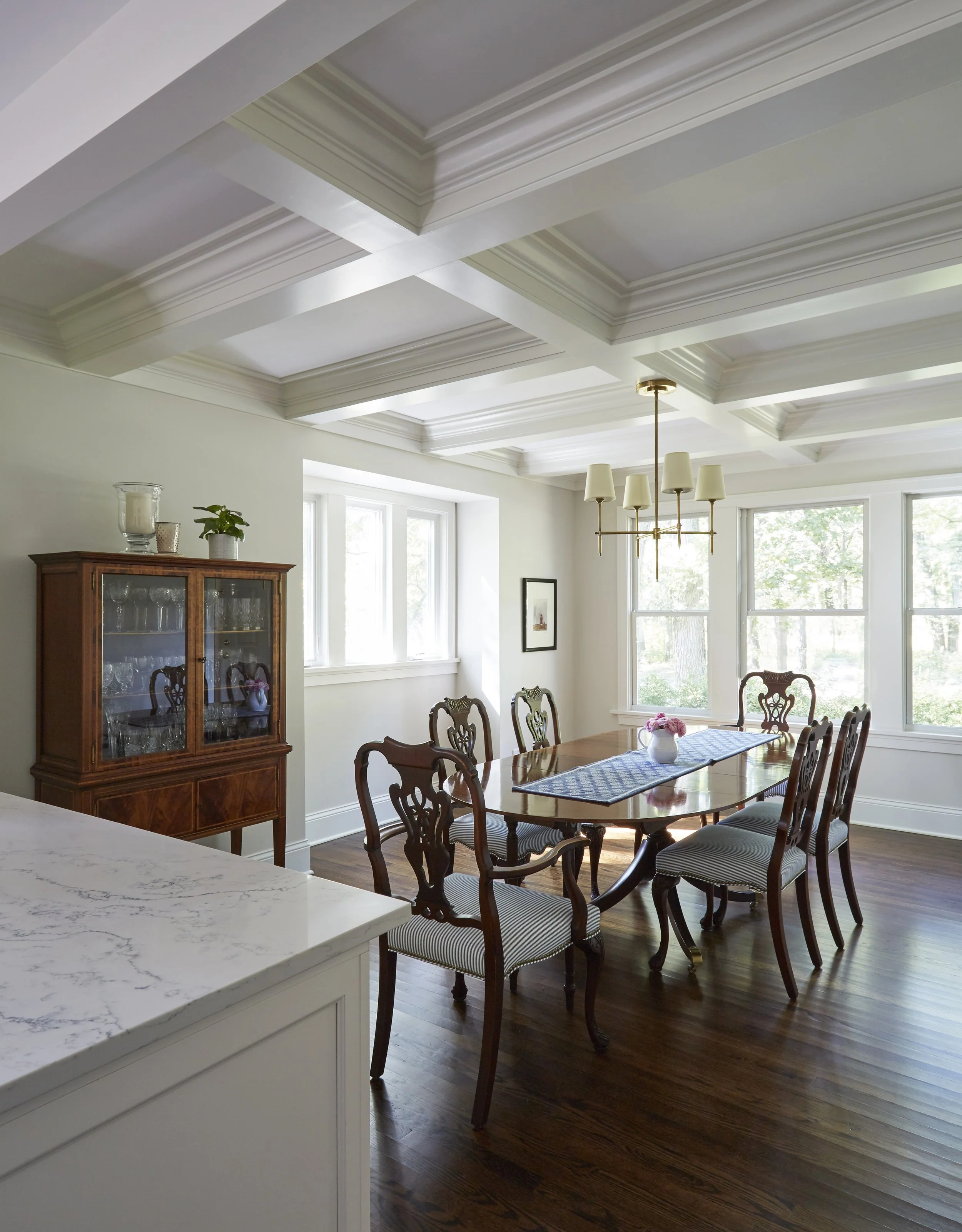 Sumptuous natural light and a detailed coffered ceiling lend elegance to the dining room.