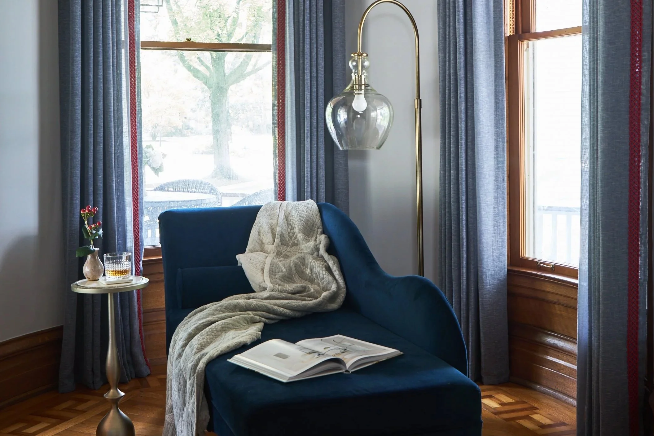 Inside the turret is a cozy reading nook with custom window treatments and chaise lounge.