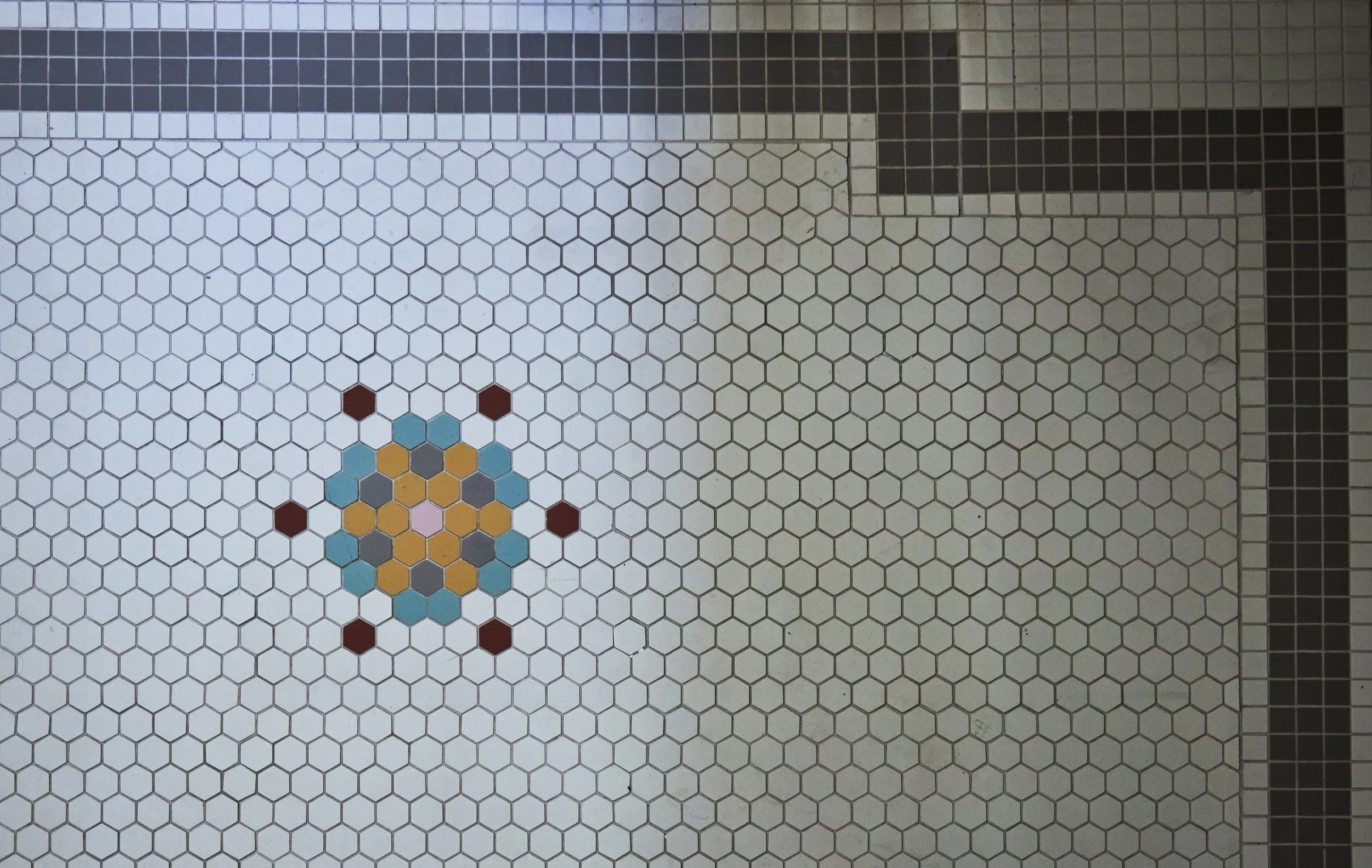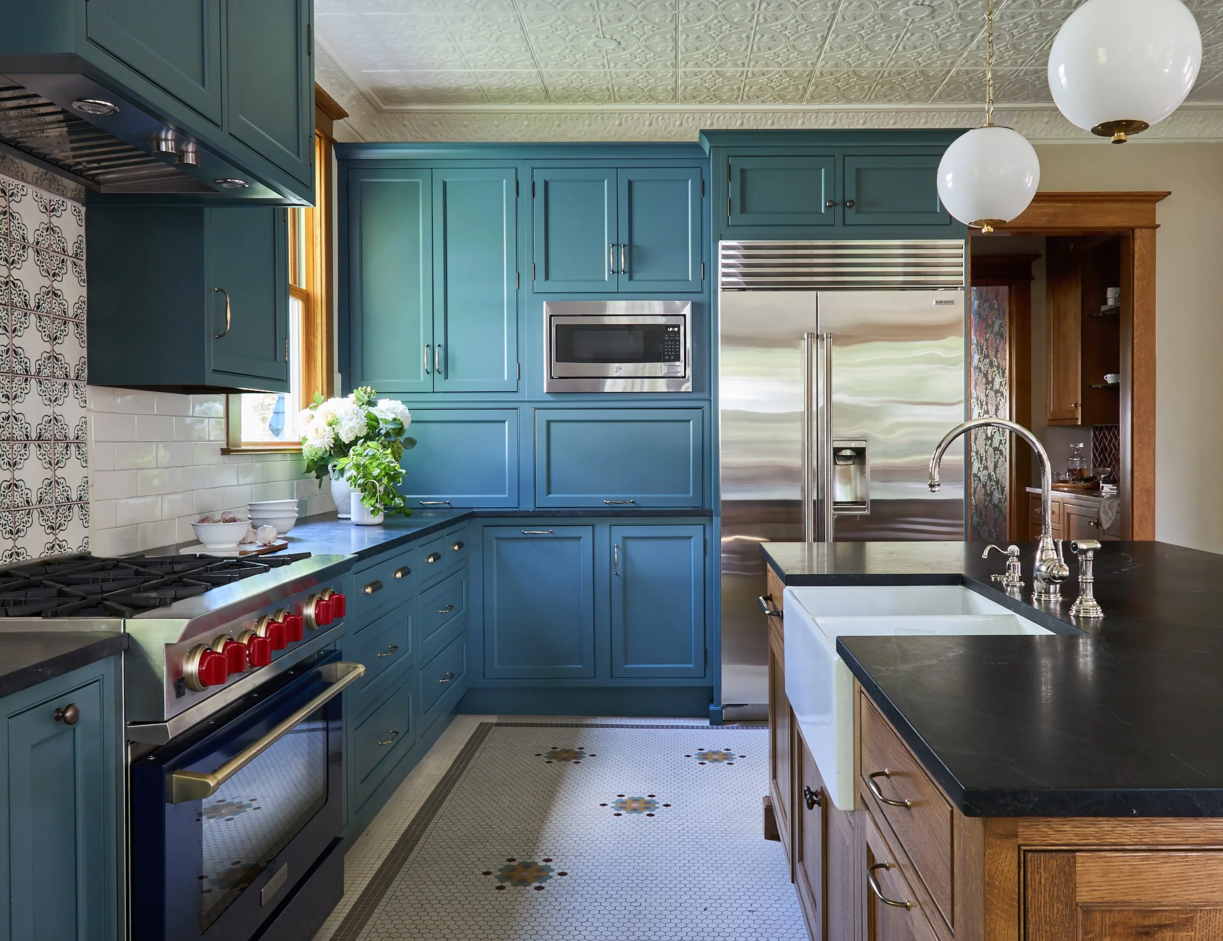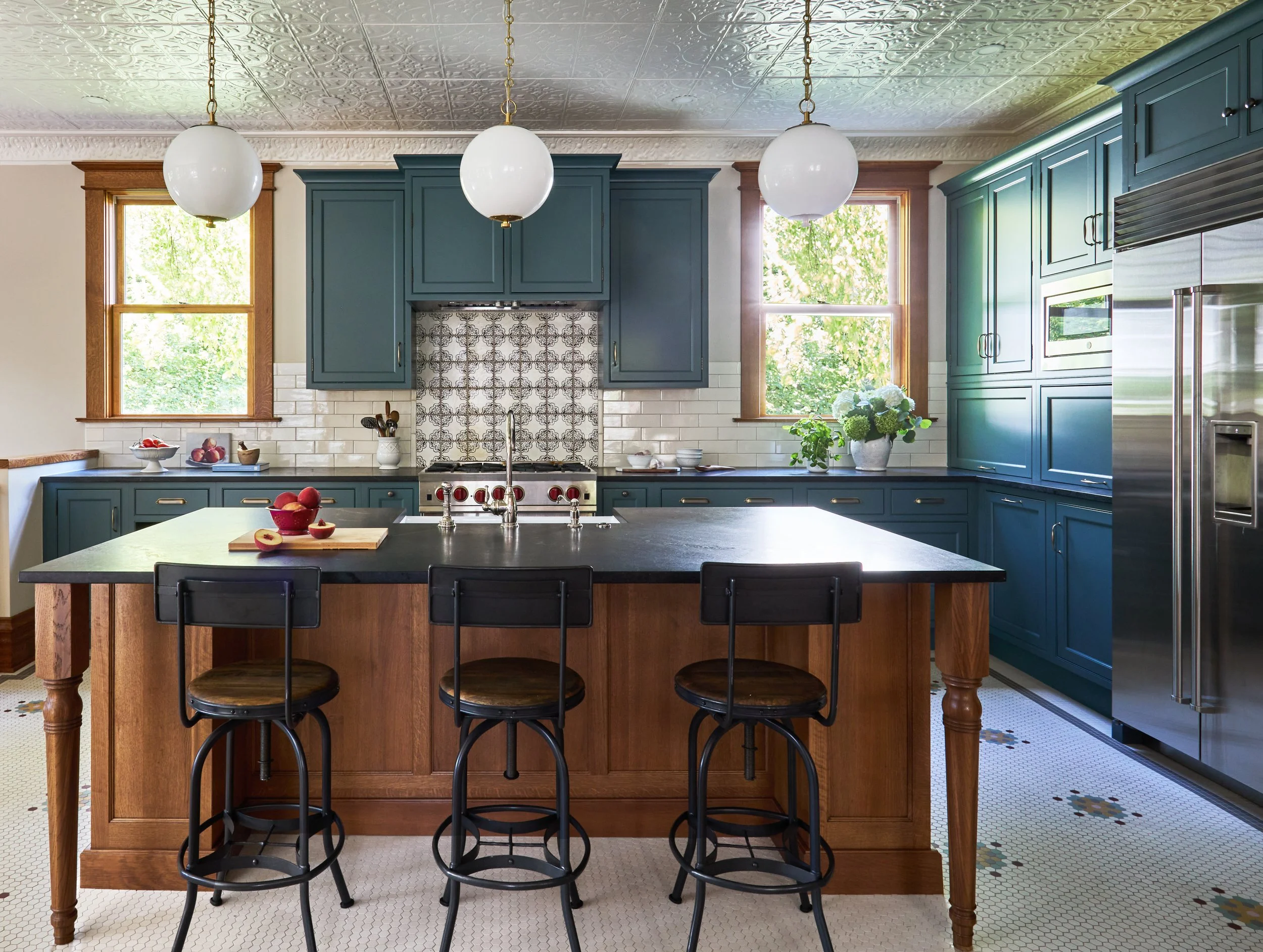 So many details! A custom hexagon tile floor, quarter-sawn oak island, and painted inchyra blue cabinetry.