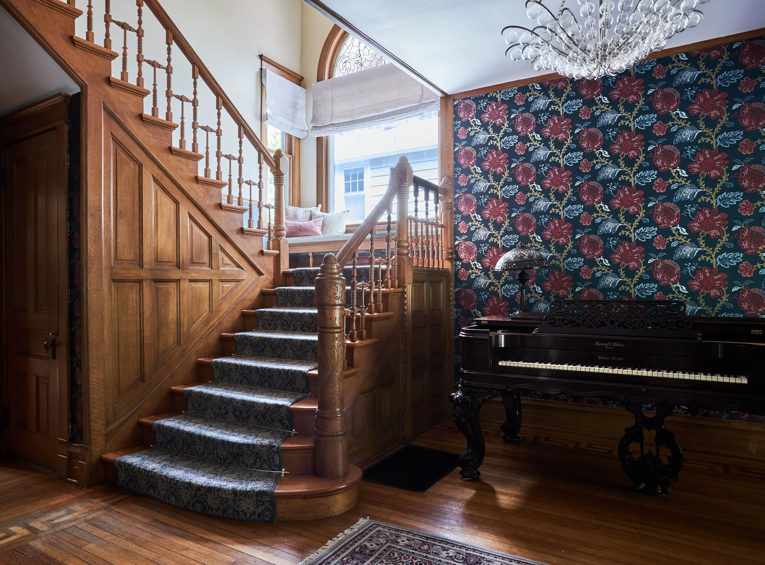 The home’s grand foyer features all original millwork and architectural details. The addition of wallpaper, lighting and stair runner completed the space.